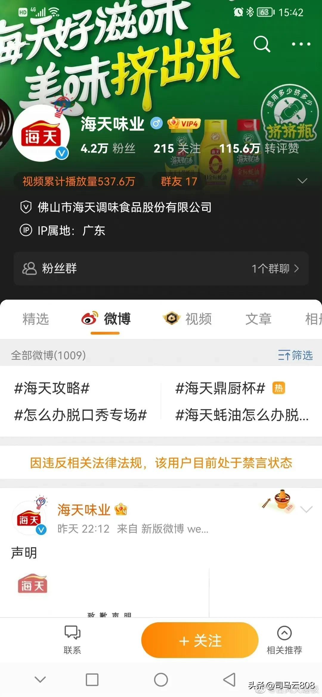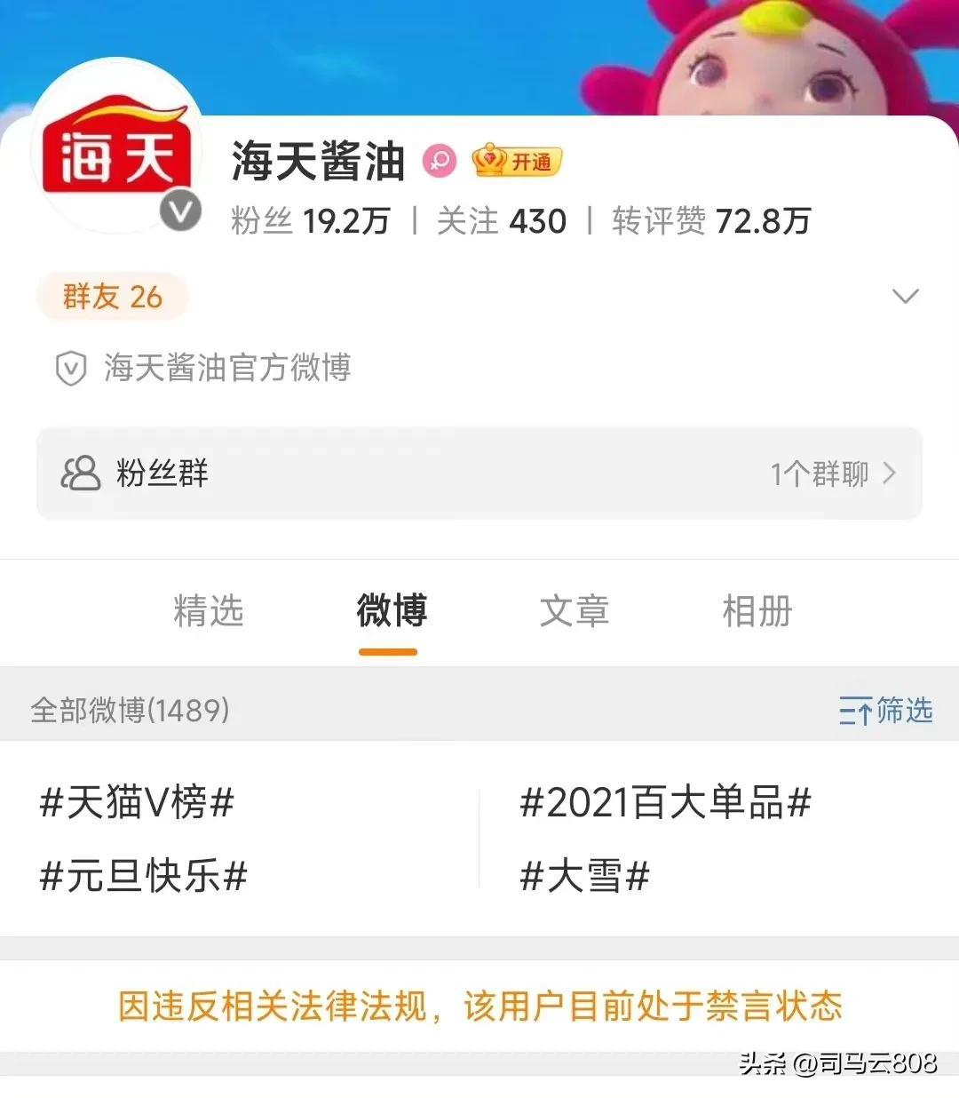 这件事儿对海天的影响很大 ,海天多年呕心沥血经营的品牌 和市场 ,就这样受到了很大的影响,海天官方微博被禁言。