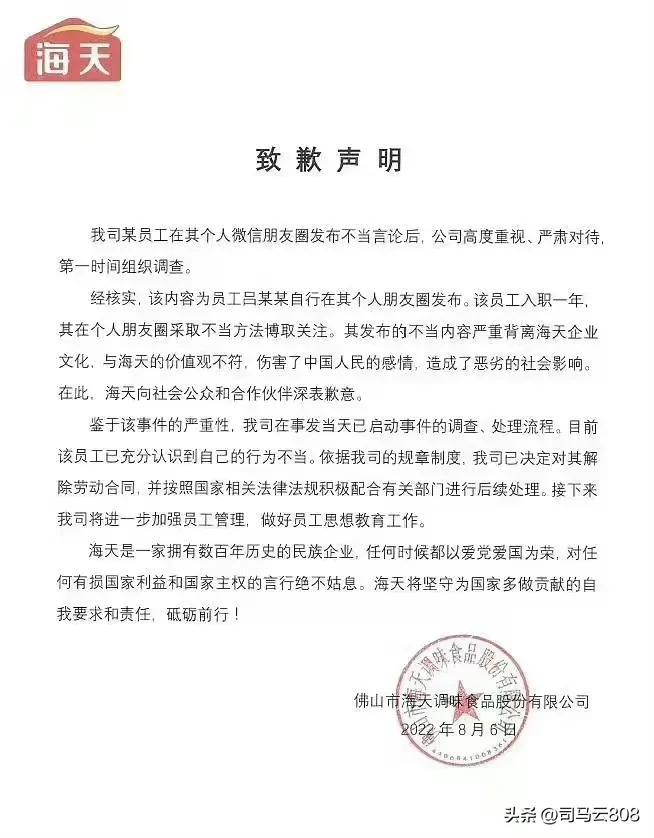 能惹事儿不能担事儿,惹了事儿还得公司替他出来买单。海天马上发表致歉声明。